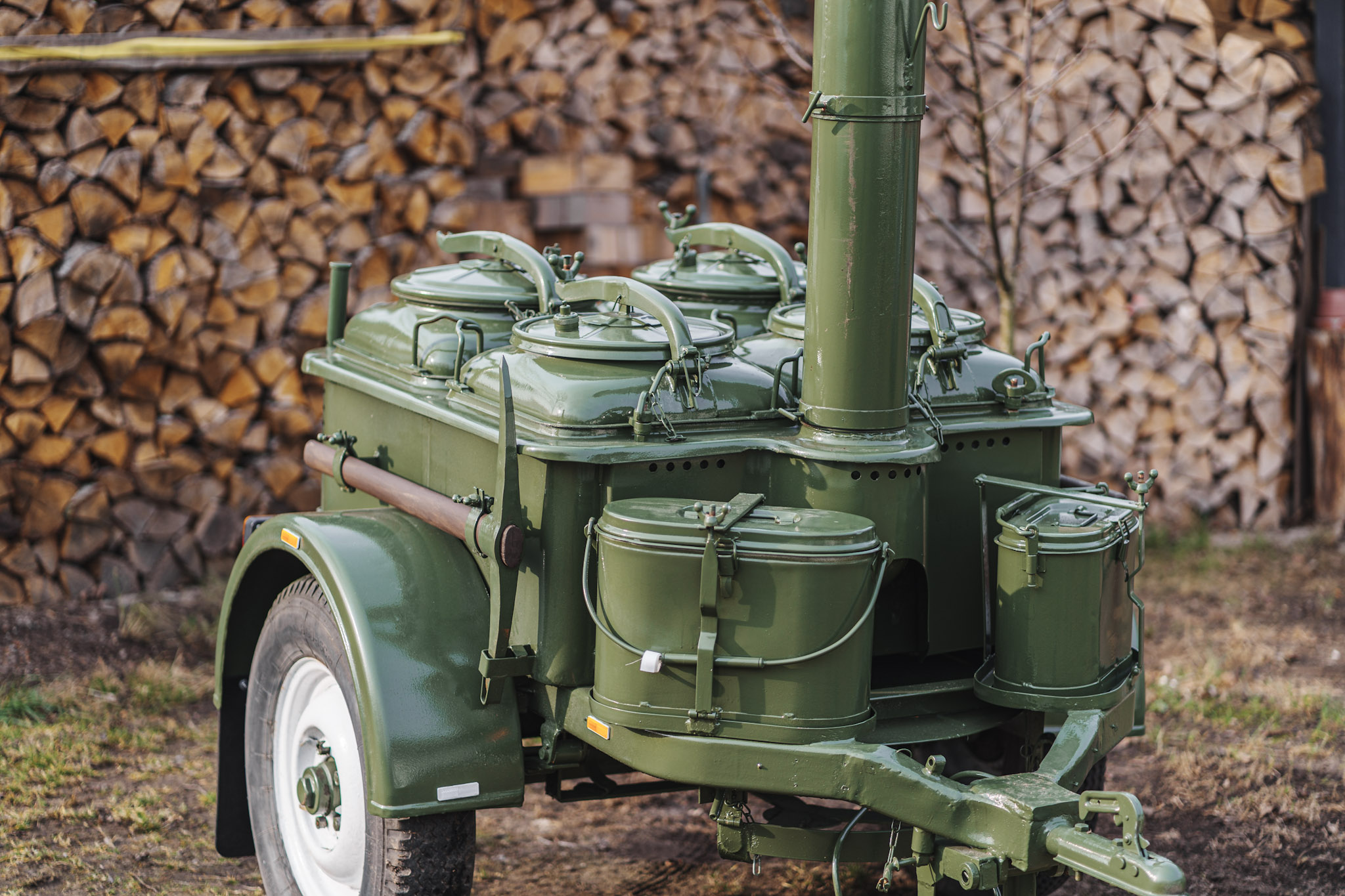 Tradycyjna wojskowa kuchnia polowa opalana drewnem.